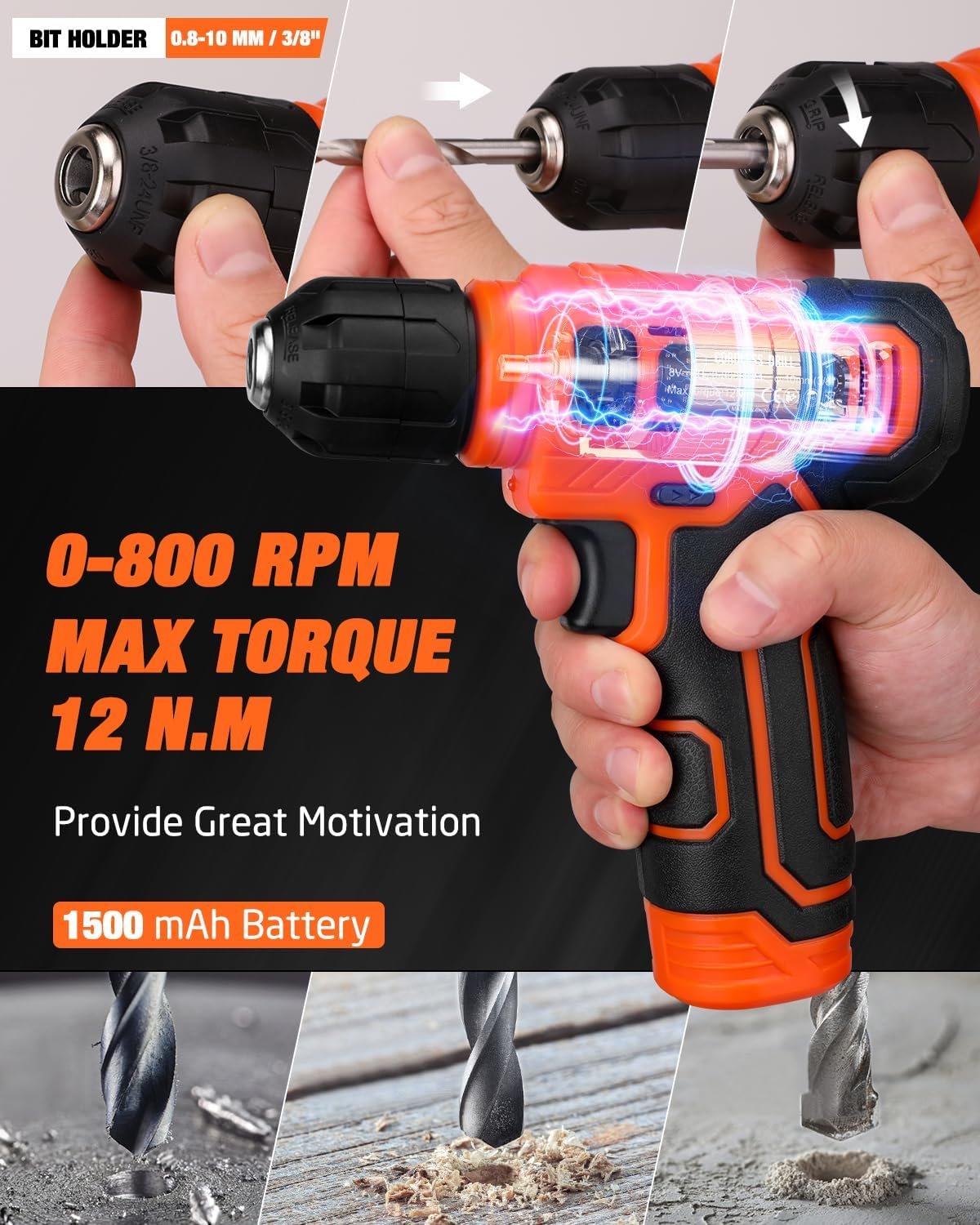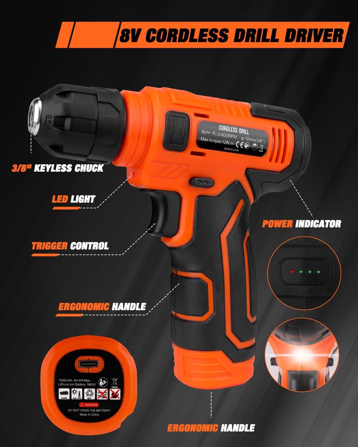 8V Power Cordless Drill with LED: Featuring a compact, ergonomic design, this drill boasts a non-slip grip for secure handling. Its lightweight build enhances maneuverability, while adjustable speed settings (up to 800 RPM no-load speed) adapt to varied applications. The integrated LED light ensures visibility in low-light conditions.