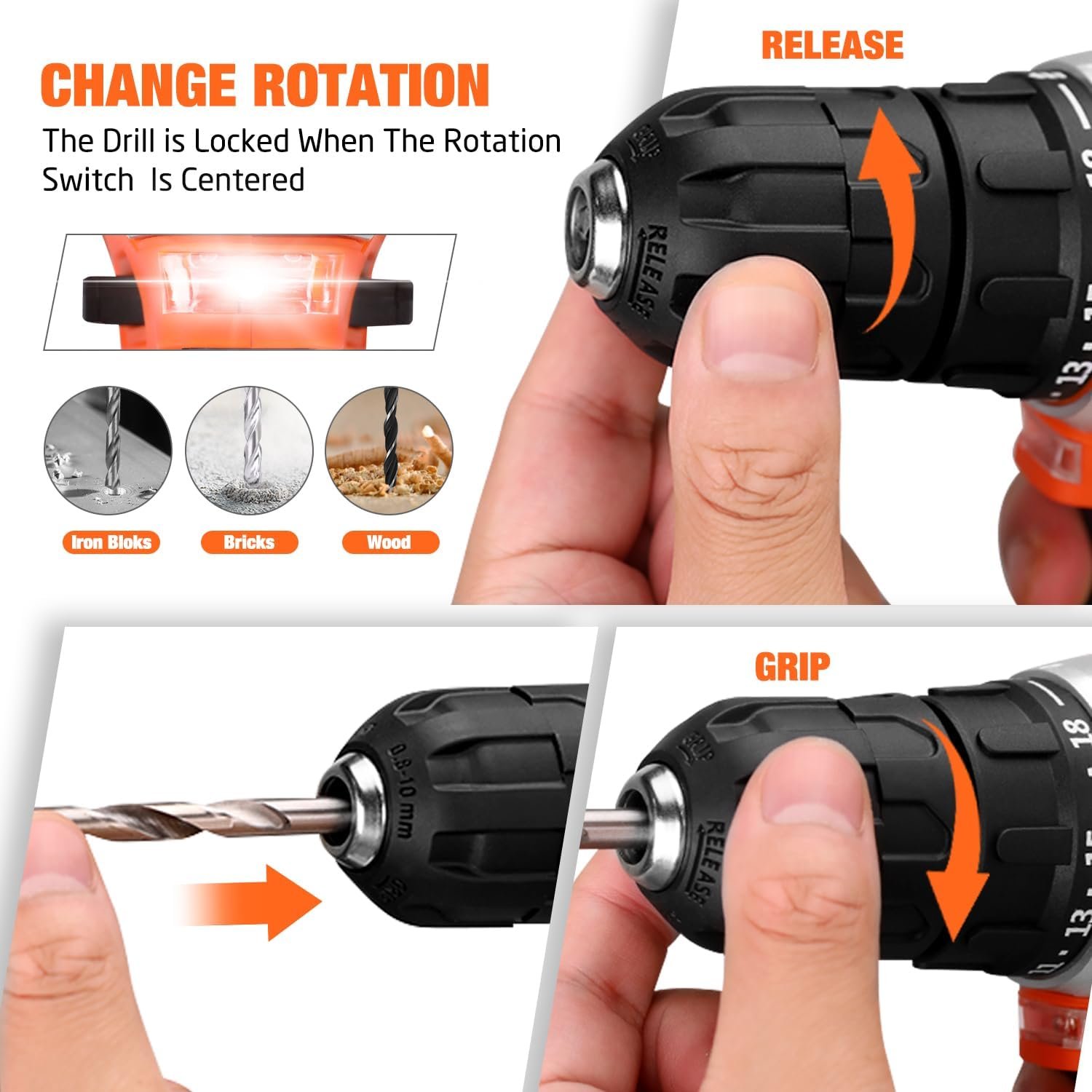 12V Cordless Power Drill: Equipped with a 1.5Ah rechargeable lithium-ion battery, delivering a max speed of 1500 RPM. It features integrated LED lighting for working in dark areas, dual-speed control, and a 3/8-inch (10mm) keyless chuck, making it versatile for various applications. While the ergonomic handle ensures comfort during extended use.