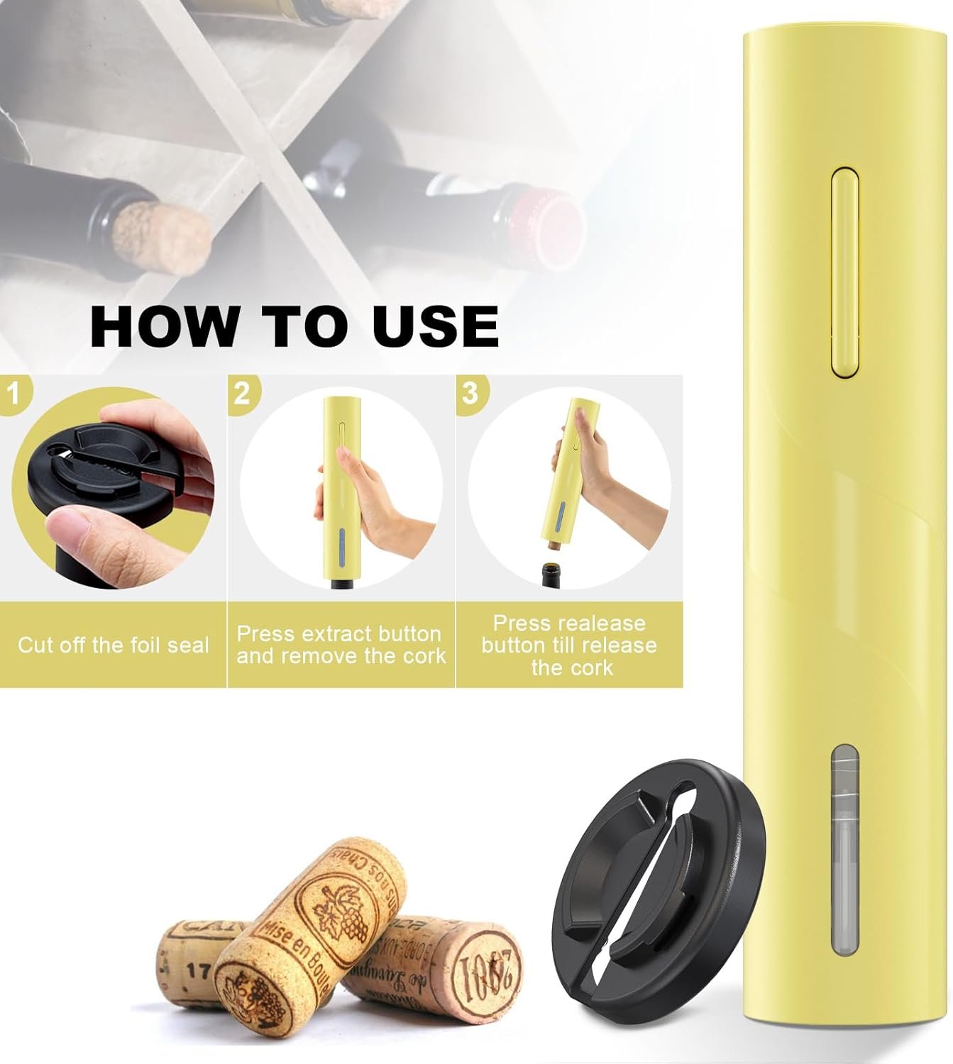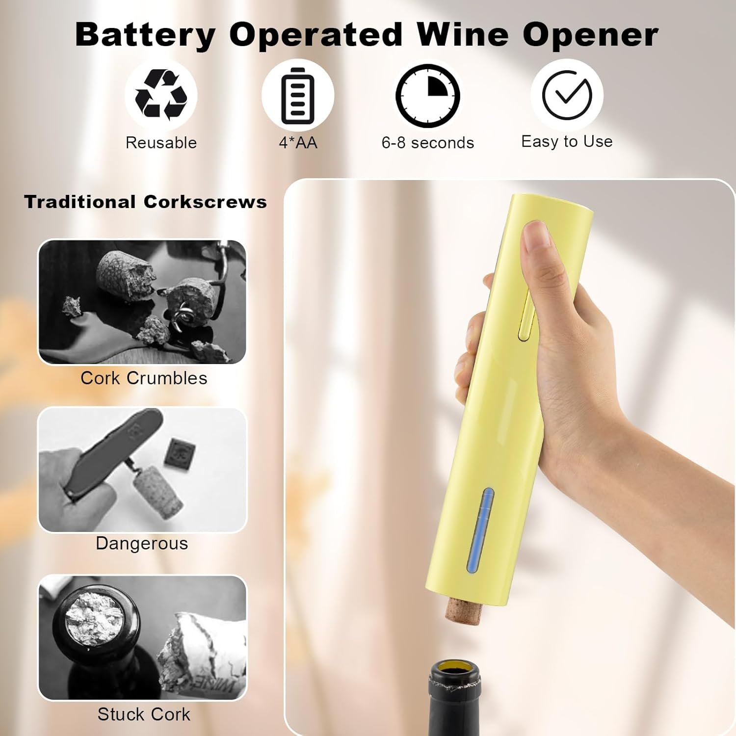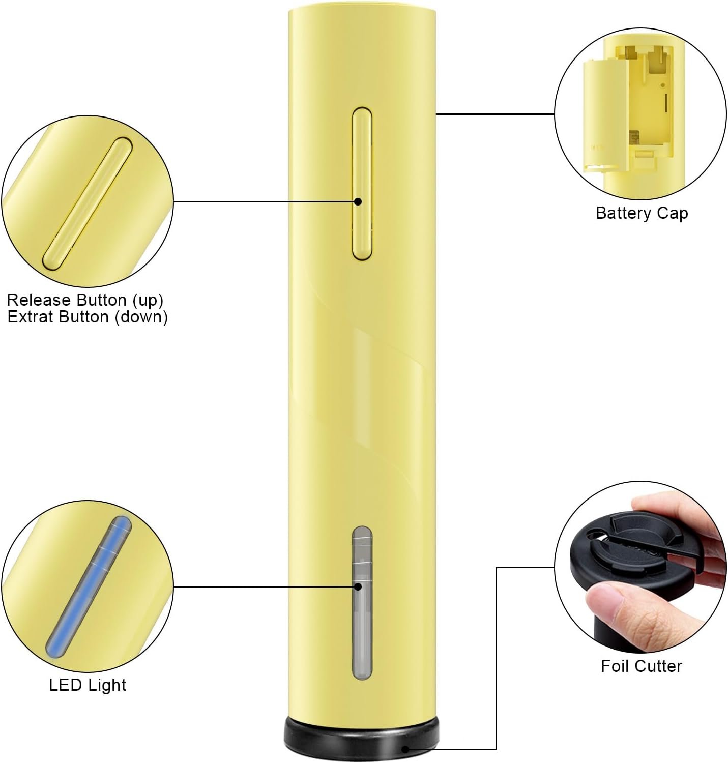 Simple Operation: Peel, Pop & Push—Only 3 steps to remove the cork in seconds. Totally automatic operation with battery. 4 AA batteries required (no batteries included). The removable foil cutter attached to the bottom will be more safety and convenient