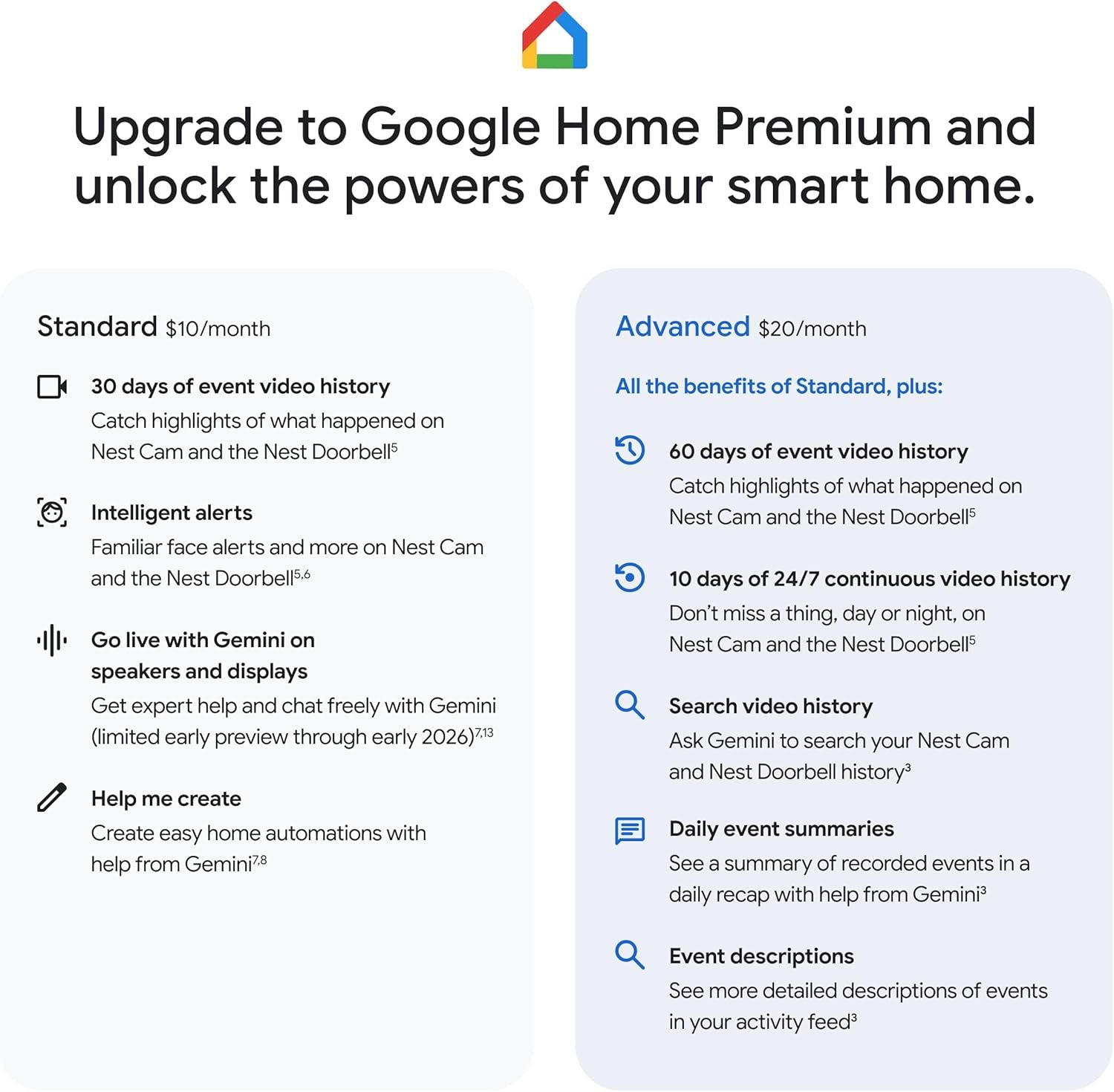 With an Advanced subscription to Google Home Premium, know more about whatโs happening with notifications like โKids are playing soccer in the living roomโ[3]; and get even more detailed descriptions and tap to see a summary of what happened[3]
