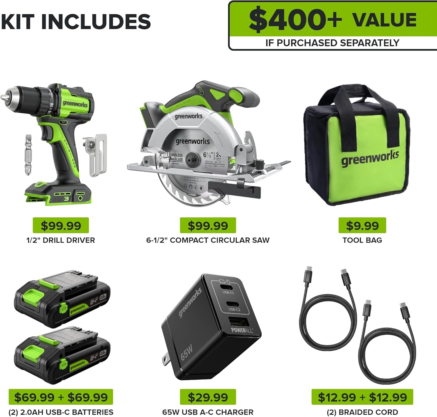 ๐ฅ Hot Deals Today ๐ฅ GREENWORKS 24V 1/2โ Brushless Cordless Drill (400 In-lbs.) + 6.5โ Circular Saw (4,800 RPM), (2) 2.0Ah (12,000mAh Power Bank) USB-C Batteries, Braided Cable, 65W Rapid Charger