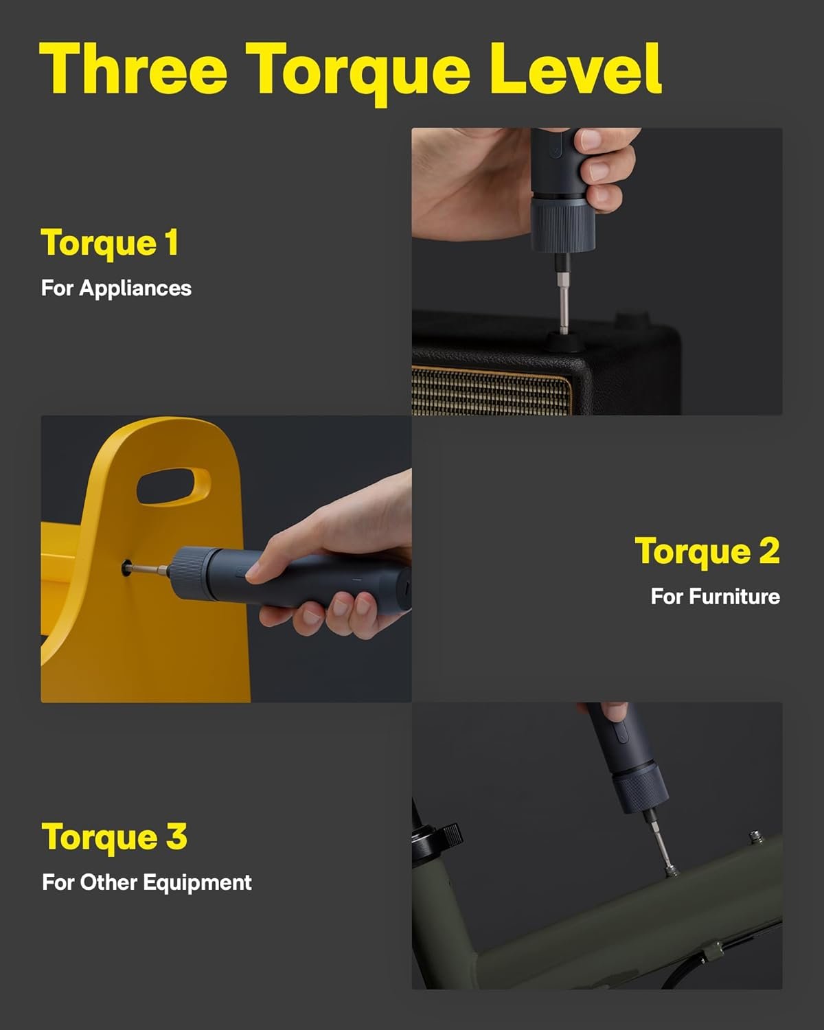 Three Torque Settings: Offers three adjustable torque levels for different applications. Electric mode delivers up to 4 NΒ·m, while manual mode provides up to 8 NΒ·m for extra control. The built-in smart sensor stops rotation when the button is released, ensuring safe and precise one-handed operation