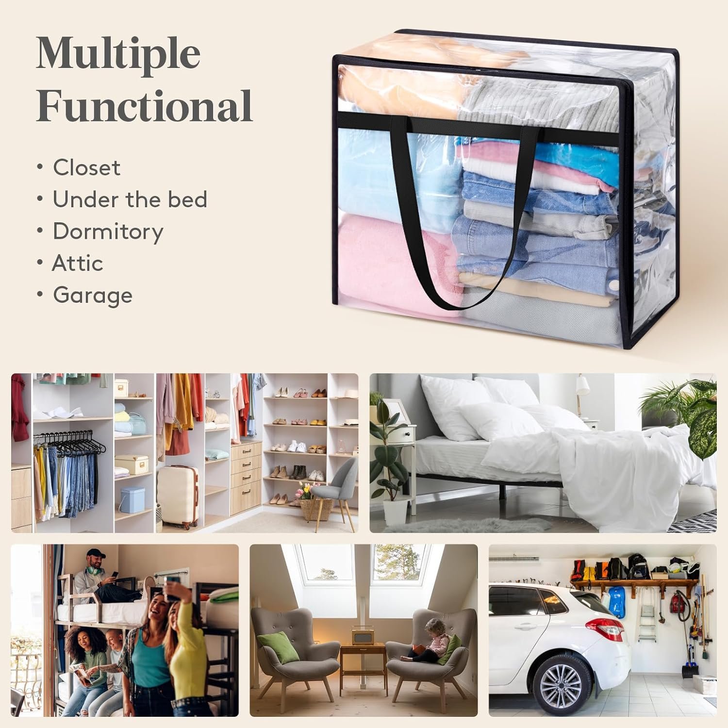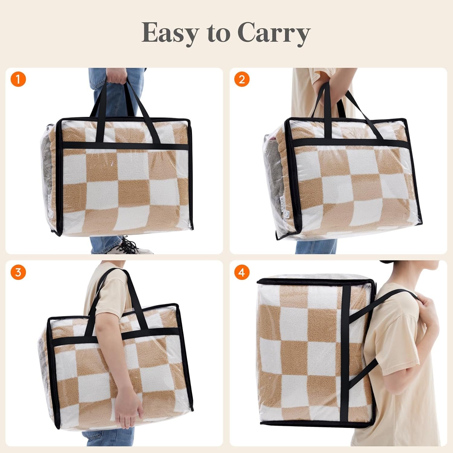 Easy to Use: The storage bins with lids feature reinforced carry polyester webbing handles for enhanced sturdiness. With their ample length, these handles allow for easy one-handed carrying or convenient shoulder transportation. The transparent color of the comforter storage bag enables effortless visibility, allowing you to quickly locate and access your belongings