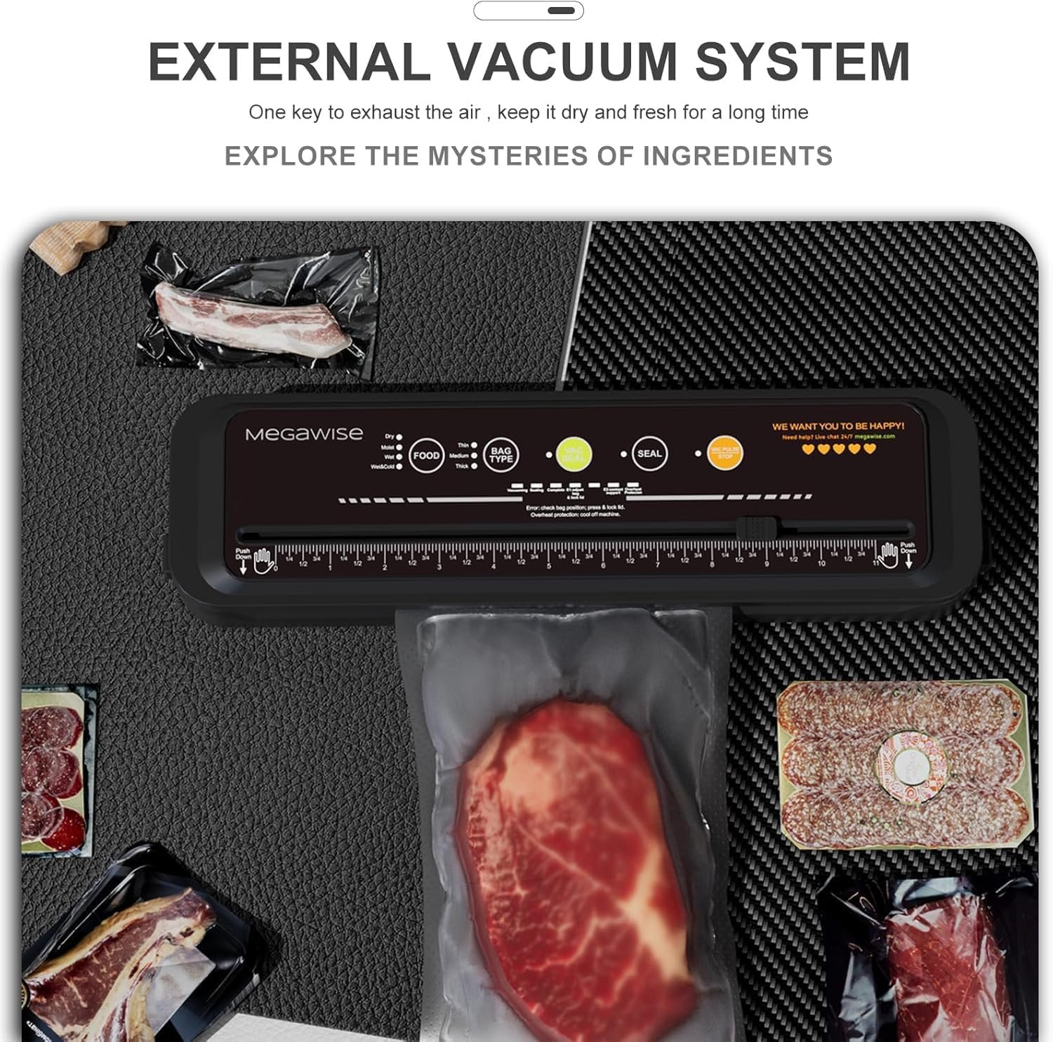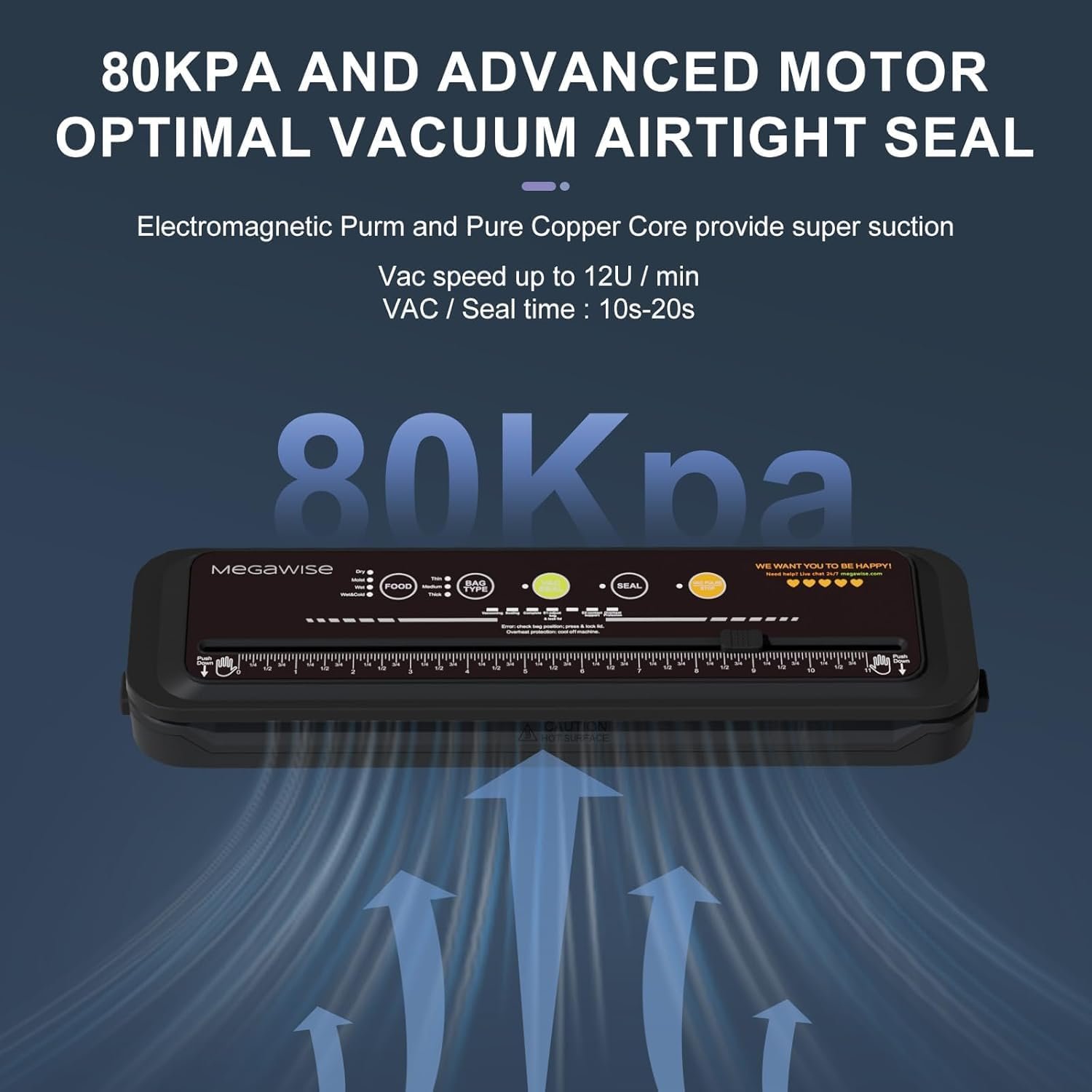 Mega Power💕 Save Your Energy: Effortlessly preserve your food! With its 80kPa powerful suction and high-grade heating wire, our MegaWise vacuum food sealer delivers an optimum vacuum seal in just 10-20 seconds. Keep your food fresh up to 5 times longer, and avoid wasting meals by throwing them in the trash due to ice crystal buildup in the fridge.
