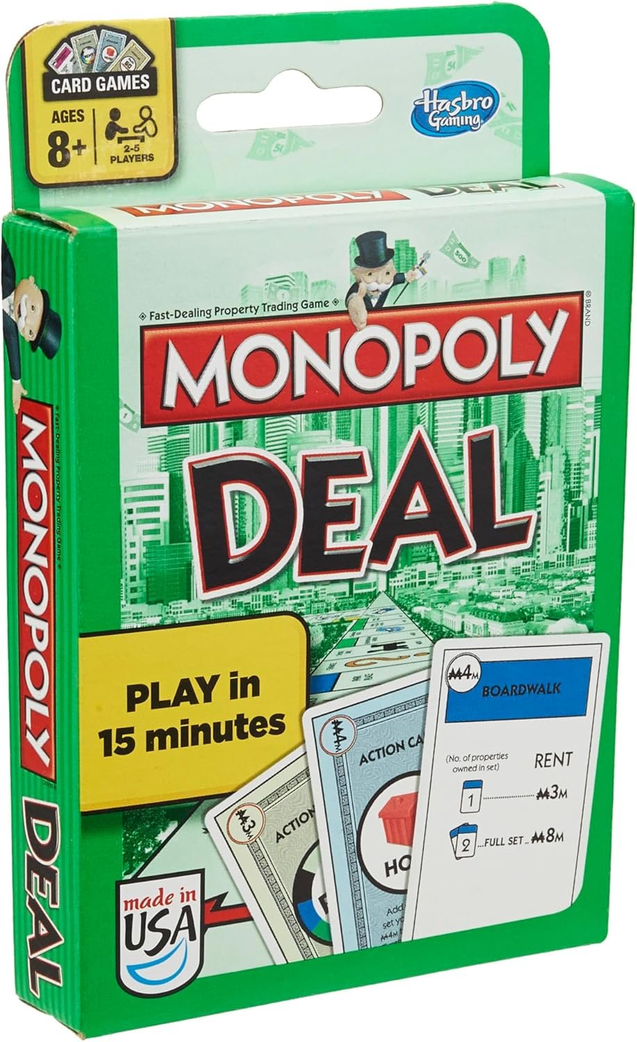 Swap, steal, and scheme with the Monopoly Deal card game! Be the first player to collect 3 complete Property card sets, each in a different color, to win. This deck includes 110 cards: Property cards, Wild Property cards, Action cards, and Money cards. Wild Property cards help players build Property sets. Action cards mix up the game by letting players collect rent, steal and swap properties, and more. And players pay their debts with Money cards. Easy to play and set up, this card game for ages 8 and up can be played in as little as 15 minutes! Whether you’re searching for fun games for kids and adults, family games, or kids travel games, it’s a great pick for anytime play. The Hasbro Gaming, Parker Brothers, and Monopoly names and logos, the distinctive design of the gameboard, the four corner squares, the Mr. Monopoly name and character, as well as each of the distinctive elements of the board and playing pieces are trademarks of Hasbro for its property trading game and game equipment.