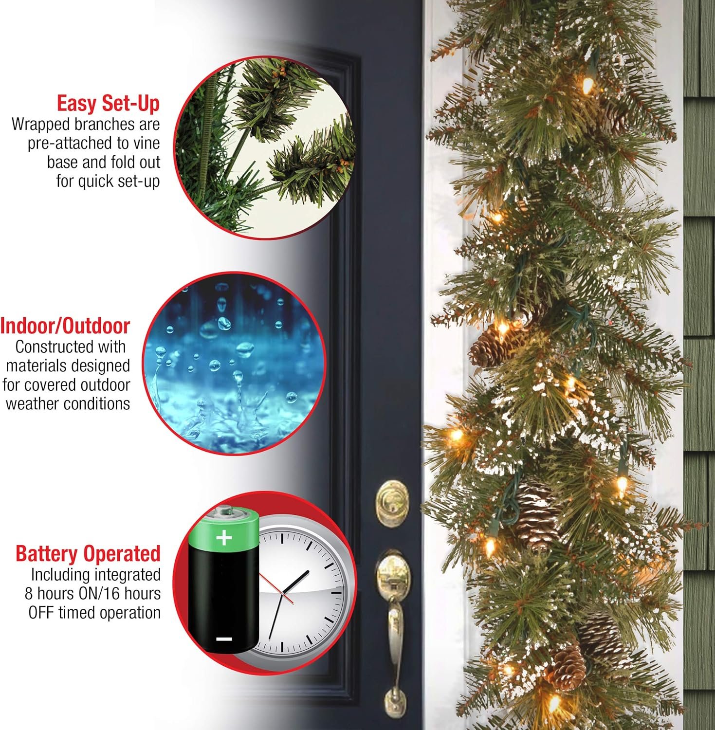 Transform your home for the winter holidays with National Tree Company’s Pre-Lit Artificial Christmas Garland. Designed with a Glittery Bristle Pine branch base, this garland is 6 feet long and decorated with pine cones. These beautifully ornate decorations complement the garlandβs natural looking branches. Made to look and feel lifelike, the stunning realism of the tree is defined by its close attention to detail, featuring tens of individually crafted branch tips that create a full bodied garland. This fantastically festive garland is strung with white UL lights prior to packaging for a more convenient setup. The lights operate individually, so if the bulb lens has not been cracked or broken, the light set will continue to illuminate except for any individual bulbs that are not working. To power the lights, simply place [BATTERIES] into the battery pack and let the pre strung lights illuminate your home with the warmth and cheer of the holiday season. Hang this decorative garland over any door, window or mantle to bring a Christmas ambience into any room or covered porch. Constructed with sturdy, high quality materials and hypo-allergenic, fire-resistant needles, this tree is built to bring holiday cheer for years to come. This hanging decoration is suitable for both indoor and covered outdoor use. At National Tree Company, we strive to create high quality Christmas decorations to help you transform your home so you can keep making every holiday moment magical.