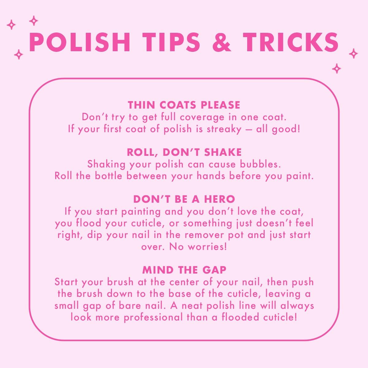 HOW TO USE – Apply a thin coat of polish to prepped nails, aiming for complete coverage in 2-3 strokes. Let dry for 5-10 minutes and follow with a second coat if desired. For best results, follow with Long-Lasting Top Coat. Use Poppy (our patented universal polish bottle handle) to make painting neater and easier.