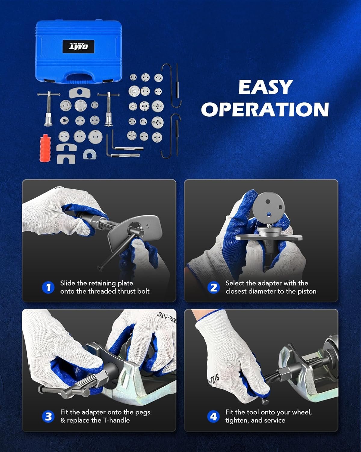 Brake Service Made Easy: This comprehensive brake tool set from Orion Motor Tech includes 24 adapters, 4 retaining plates, 2 thrust bolt assemblies, 2 hex wrenches, 2 hex rods, and an oil can, ensuring quicker and easier brake service.