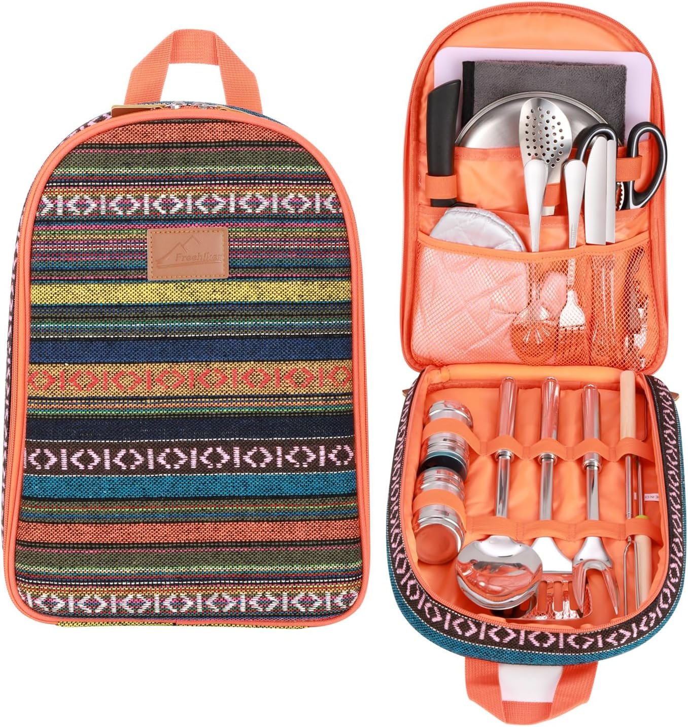 Mini kitchen on the go: Our portable utensil organizer fits all the essential kitchenware for the comfiest outdoors dining experience: 1*storage bag, 1*cutting board, 1*barbecue fork, 1*slotted tongs, 1*chef’s knife, 1*wine opener, 1*ladle, 1*scissors, 1*slotted turner, 1*Heat-insulated gloves, 1* Cleaning Towel, 2*extendable BBQ forks, 2*plates, 2* Seasoning bottles, 2*Flatware cutlery set(3pcs), the bag has additional space so you can personalize your kit.