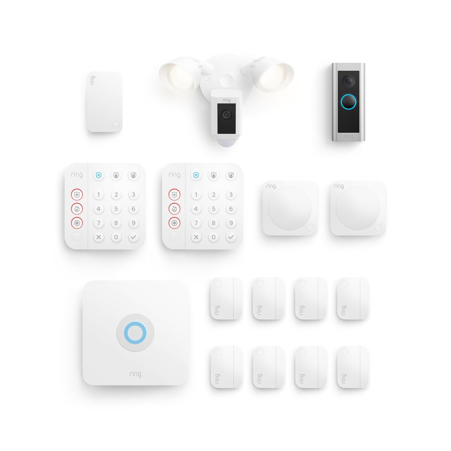 This bundle contains Ring Alarm 14-Pice Kit, Ring Wired Doorbell Pro (Satin Nickel), and Ring Floodlight Cam Wired, Plus (White)