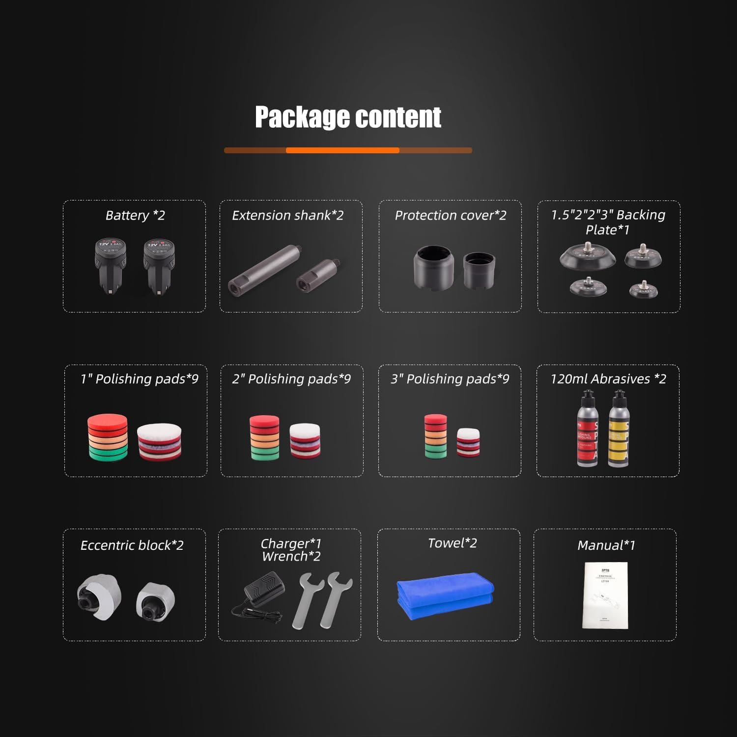 You will get polishing machine*1, 1x 120ML coarse compound,1x 120ML fine compound, battery*2, extension shank*2, protective cover*2, backing plate*4, charger*1, wrench*1, towel*2, 9 pcs 75MM polishing pads, 9 pcs 50MM polishing pads, 9 pcs 38MM polishing pads.