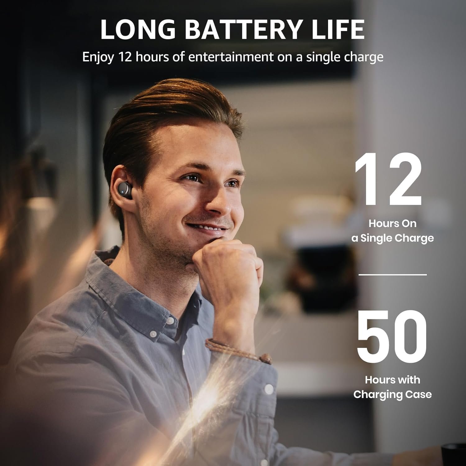 [50 Hours Total Playtime for All-Day Listening] Enjoy up to 12 hours of continuous playback on a single charge, extended to 50 hours with the charging case—perfect for travel, workouts, and long workdays without frequent recharging.