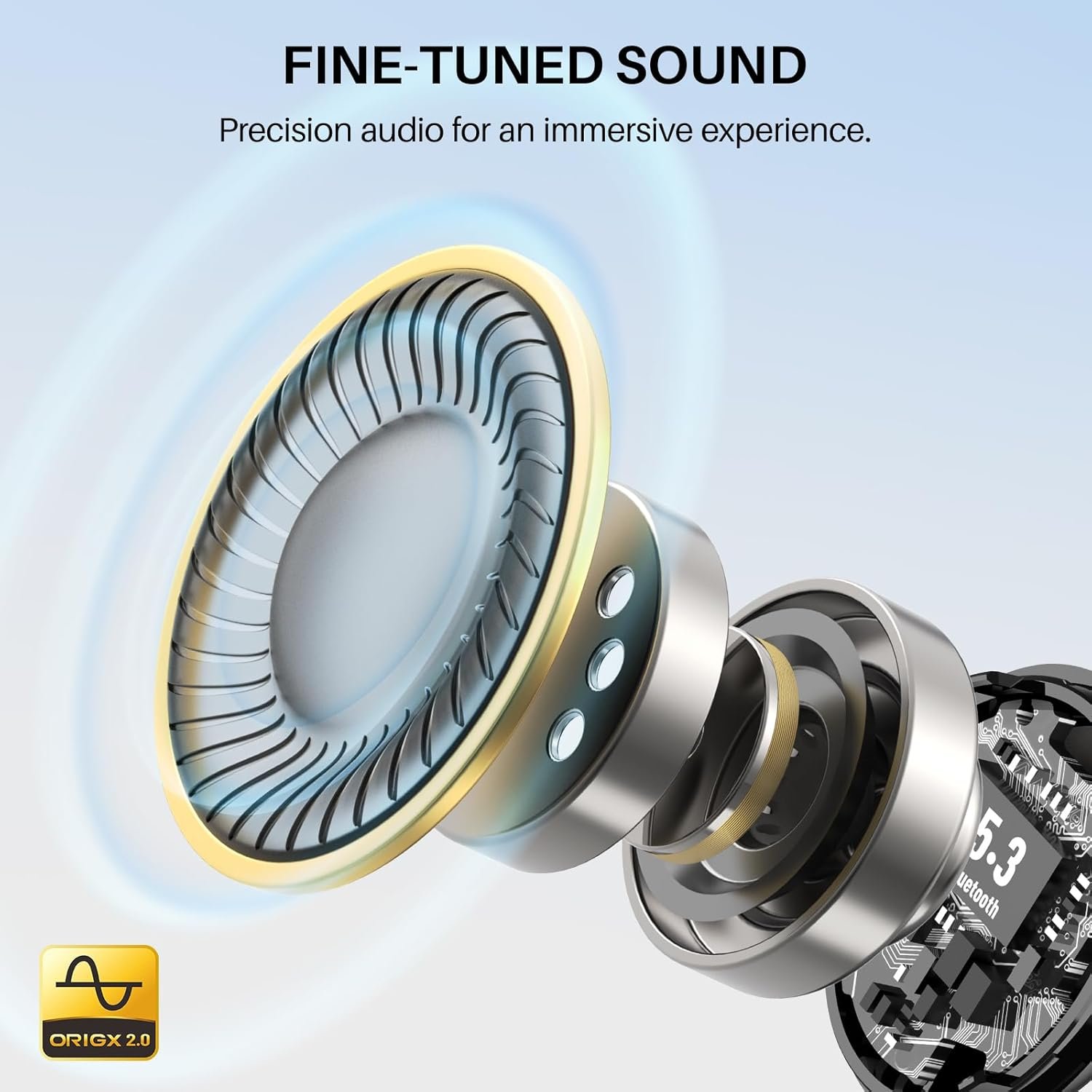 [Stereo Sound] Featuring OrigX 2.0 technology, the earbuds provide deep bass down to 18Hz, while maintaining clear mids and crisp trebles for a natural and immersive listening experience.