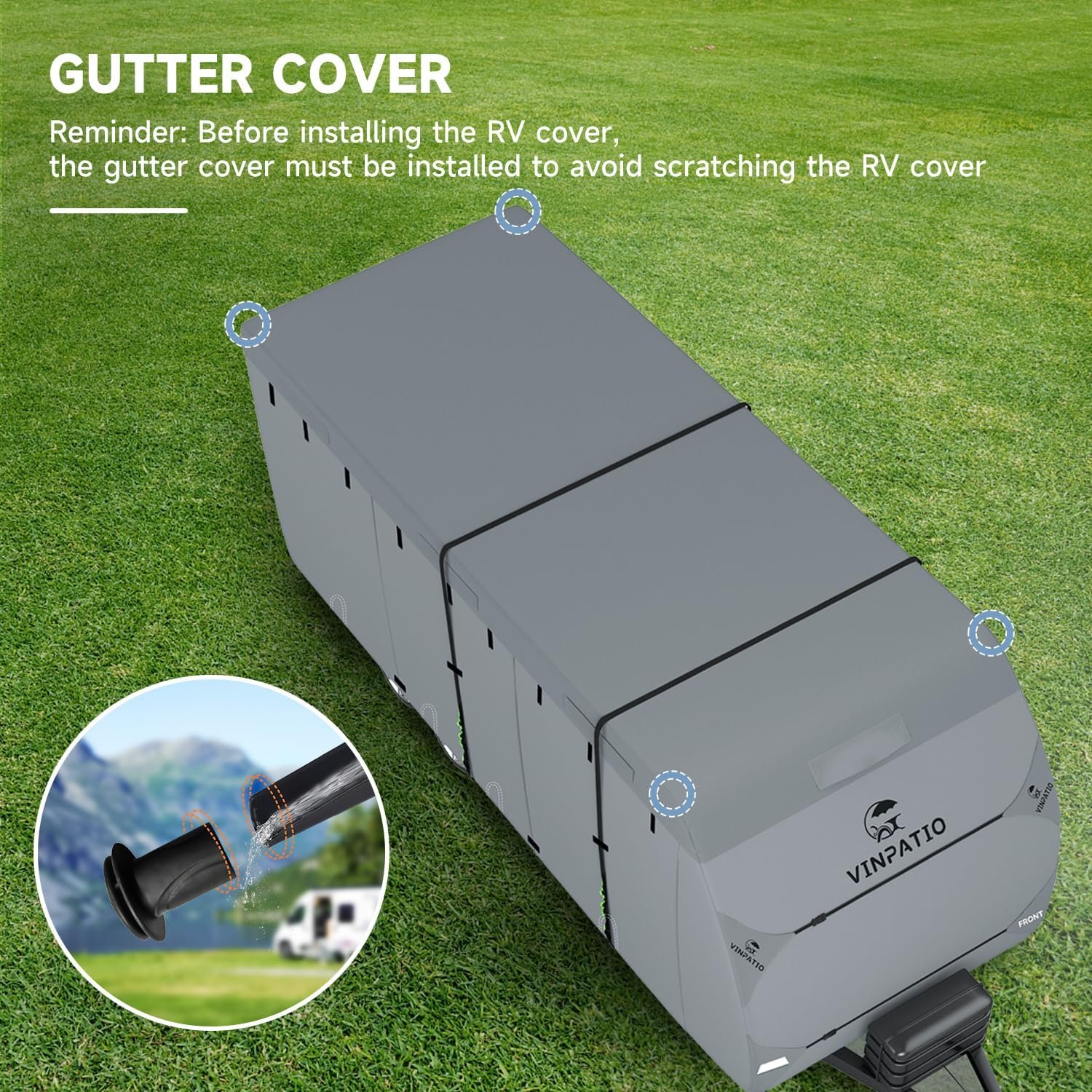✔【Windproof and Complete Accessory Kit】Our non-woven fabric RV cover comes with a range of practical accessories. It includes windproof straps to securely fasten the cover around the RV body, preventing it from being blown away or torn. Additionally, we provide 6 drain gutter covers with sponges to prevent any scratches during installation. We recommend covering or padding any sharp edges with a towel, cloth, or foam pad to prevent damage to the cover.