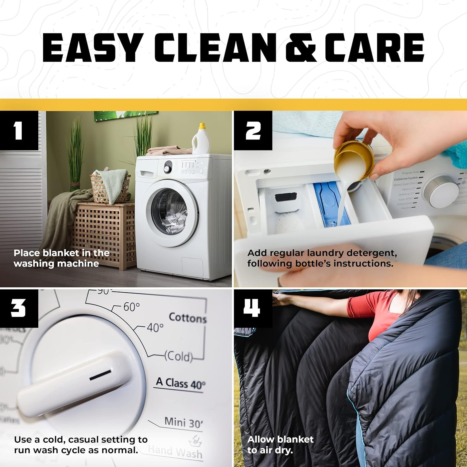Simply put our camping blanket in a washing machine, use regular laundry detergent, wash on a cold setting, and air dry to keep your blanket as good as new.