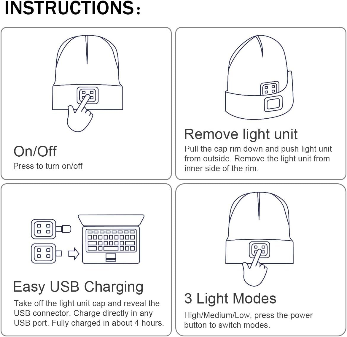 Material: 100% acrylic soft, warm, lightweight, comfortable4 led lights, super brightSize: 7.28 * 7.87inchesPower supply:1 * Rechargeable Lithium Metal Battery (Included)Stylish and practical all at onceComes with easy recharging deviceThree different brightness settingsLamp can be easily removedOne size fits MostIdeal for cycling, running camping etcKeeps the head warm while lighting the pathCharging time: approx. 2 hoursCan be either hand or machine washed (remove the LED light before washing)